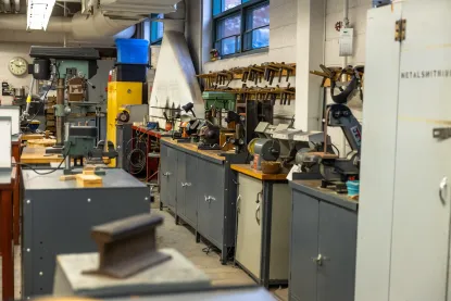 The Metalsmithing/Jewelry studio provides students with the tools, equipment, and workspace necessary to explore a wide range of processes. Students have access to facilities for general fabrication, gas and oxygen soldering, and raising and forming sheet metal. The studio also supports production casting and mold making, forging, blacksmithing, welding and fabrication, and foundry casting.